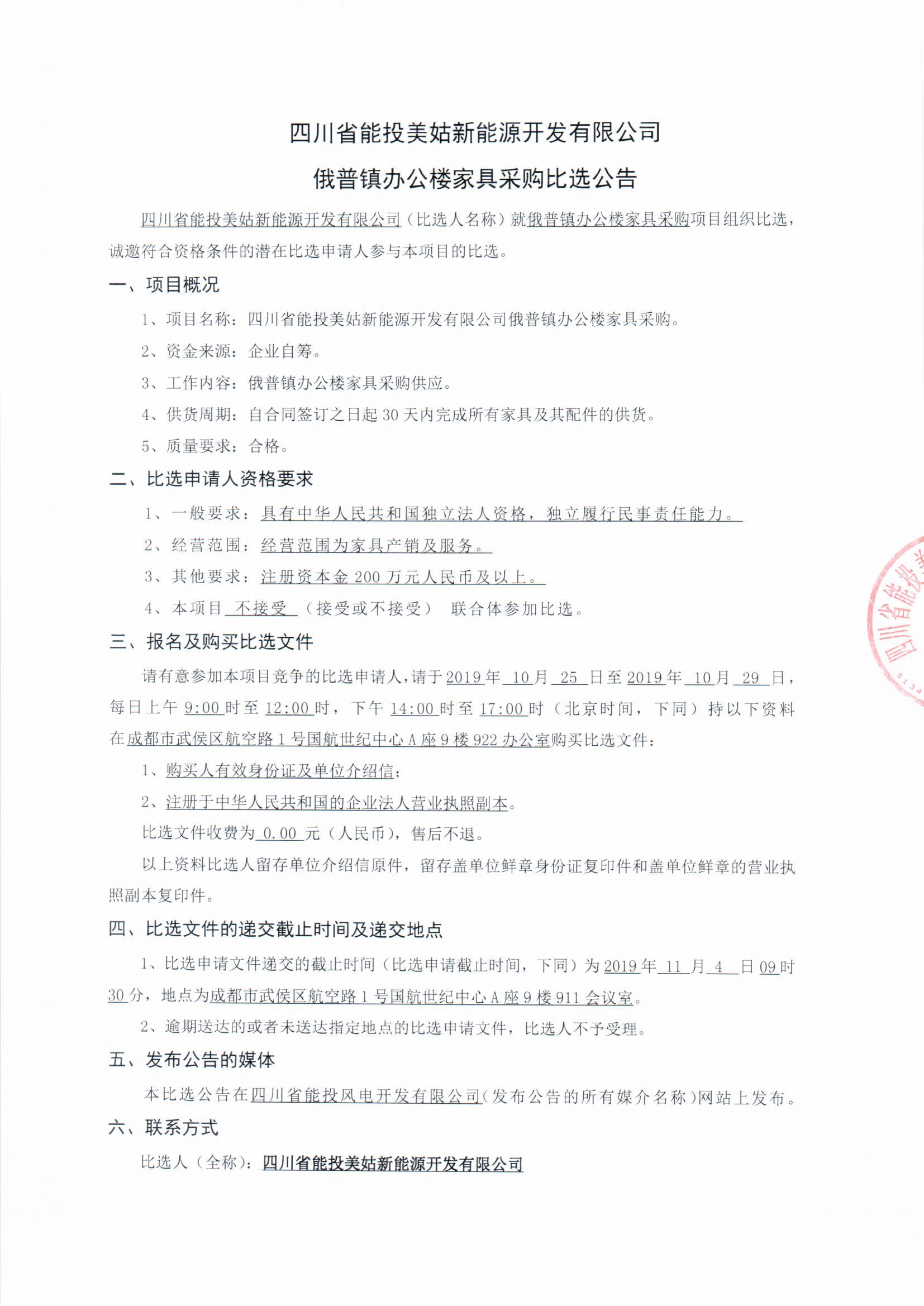 四川省能投美姑新能源开发有限公司(比选人名称)就俄普镇办公楼家具采购项目组织比选,诚邀符合资格条件的潜在比选申请人参与本项目的比选。