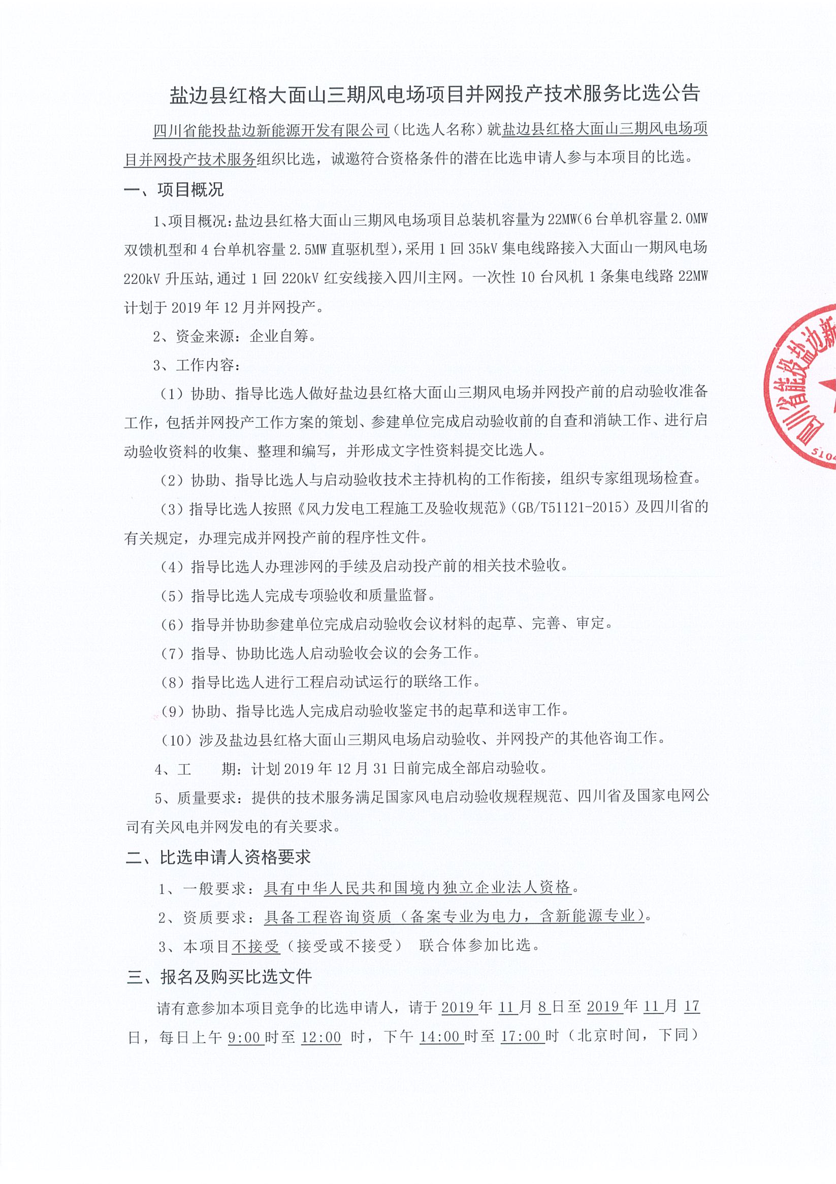 四川省能投盐边新能源开发有限公司(比选人名称)就盐边县红格大面山三期风电场项目并网投产技术服务组织比选,诚邀符合资格条件的潜在比选申请人参与本项目的比选。