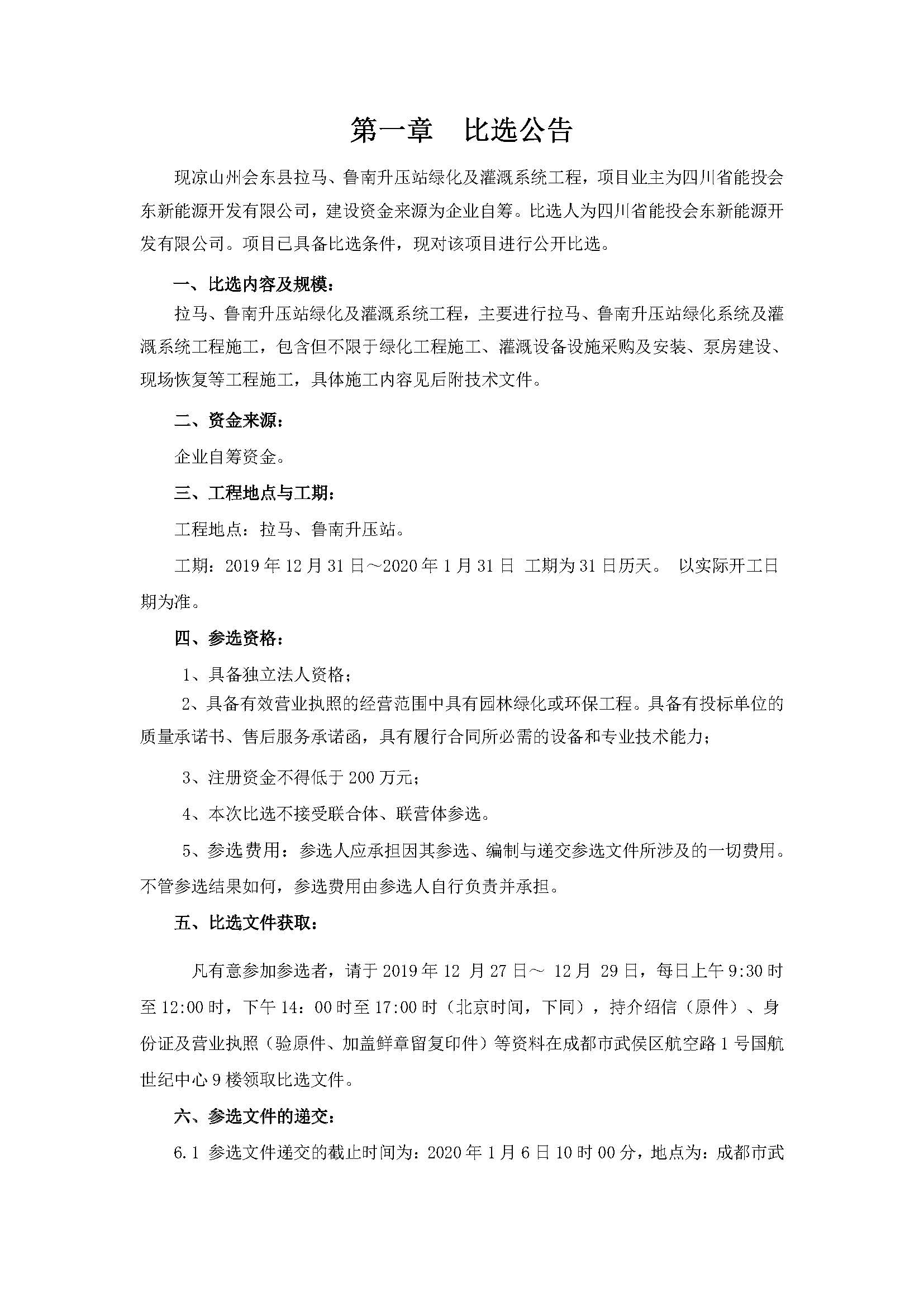 现凉山州会东县拉马、鲁南升压站绿化及灌溉系统工程,项目业主为四川省能投会东新能源开发有限公司,建设资金来源为企业自筹。比选人为四川省能投会东新能源开发有限公司。项目已具备比选条件,现对该项目进行公开比选。