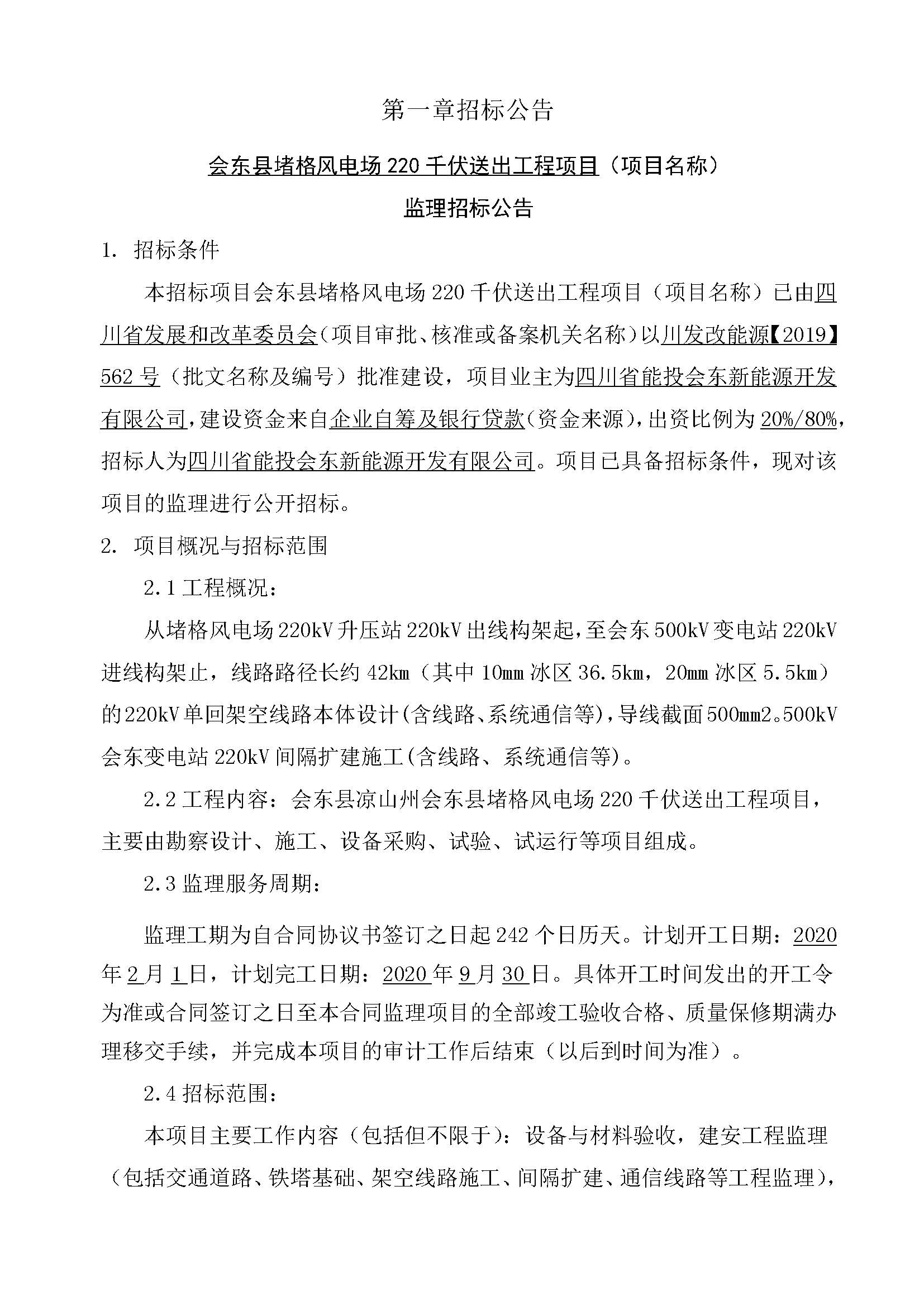 本招标项目会东县堵格风电场220千伏送出工程项目(项目名称)已由四川省发展和改革委员会(项目审批、核准或备案机关名称)以川发改能源【2019】562号(批文名称及编号)批准建设,项目业主为四川省能投会东新能源开发有限公司,建设资金来自企业自筹及银行贷款(资金来源),出资比例为20%/80%,招标人为四川省能投会东新能源开发有限公司。项目已具备招标条件,现对该项目的监理进行公开招标。