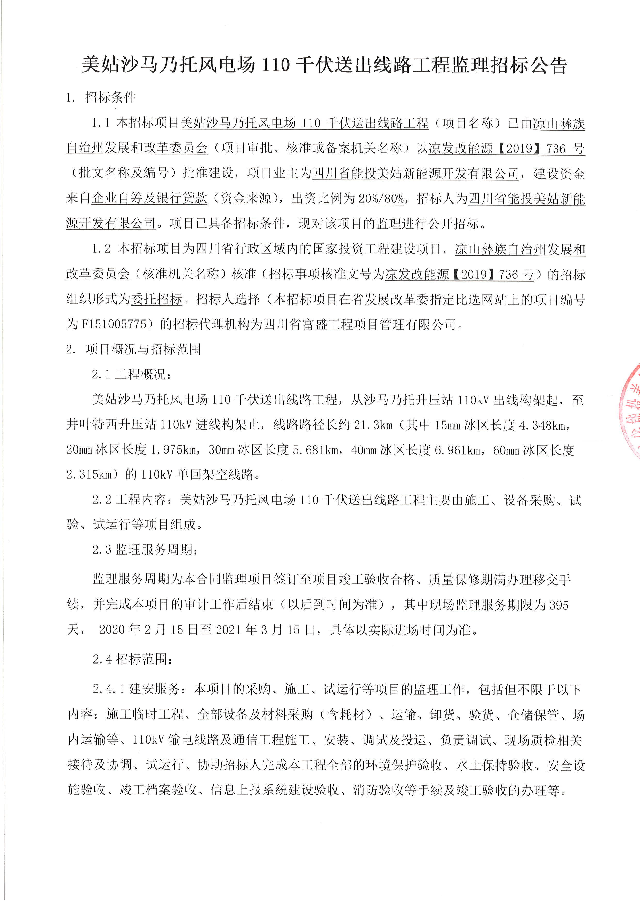 1.1本招标项目美姑沙马乃托风电场110千伏送出线路工程(项目名称)已由凉山彝族自治州发展和改革委员会(项目审批、核准或备案机关名称)以凉发改能源【2019】736号(批文名称及编号)批准建设,项目业主为四川省能投美姑新能源开发有限公司,建设资金来自企业自筹及银行贷款(资金来源),出资比例为20%/80%,招标人为四川省能投美姑新能源开发有限公司。项目已具备招标条件,现对该项目的监理进行公开招标。