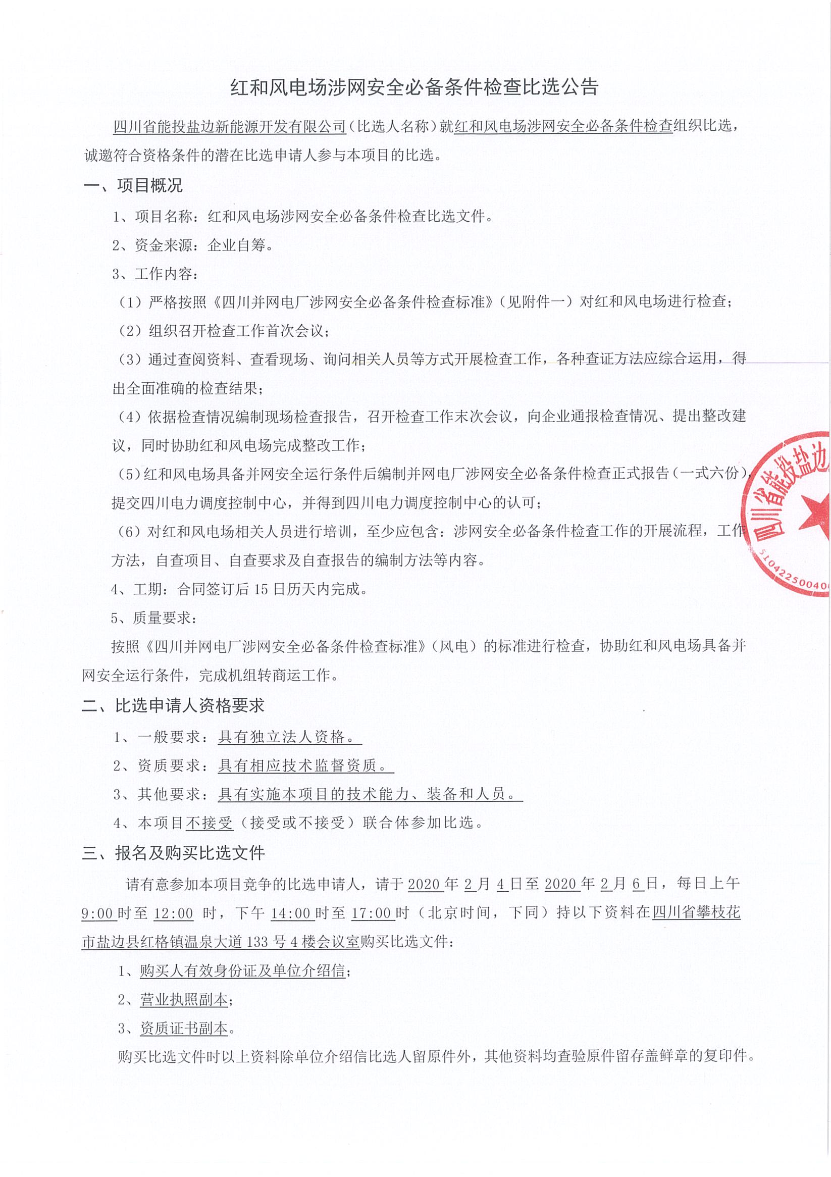 四川省能投盐边新能源开发有限公司(比选人名称)就红和风电场涉网安全必备条件检查组织比选,诚邀符合资格条件的潜在比选申请人参与本项目的比选。