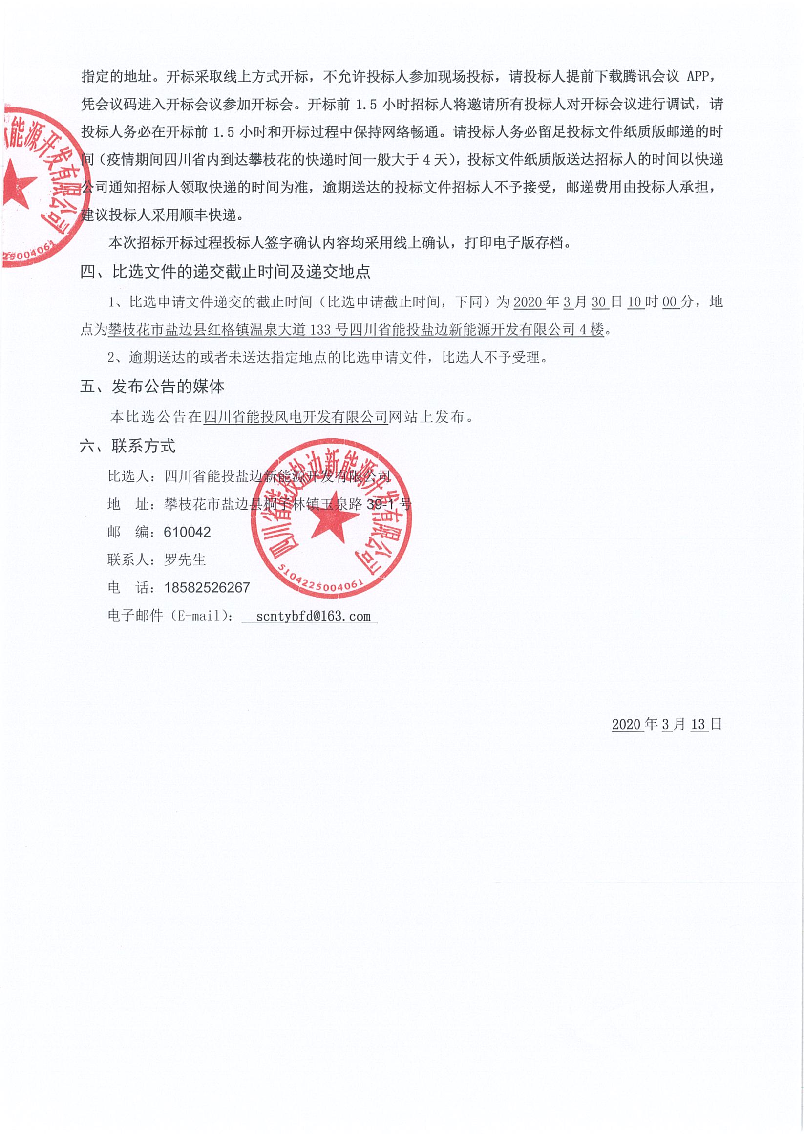 1、比选申请文件递交的截止时间(比选申请截止时间,下同)为2020年3月30日10时00分,地点为攀枝花市盐边县红格镇温泉大道133号四川省能投盐边新能源开发有限公司4楼。