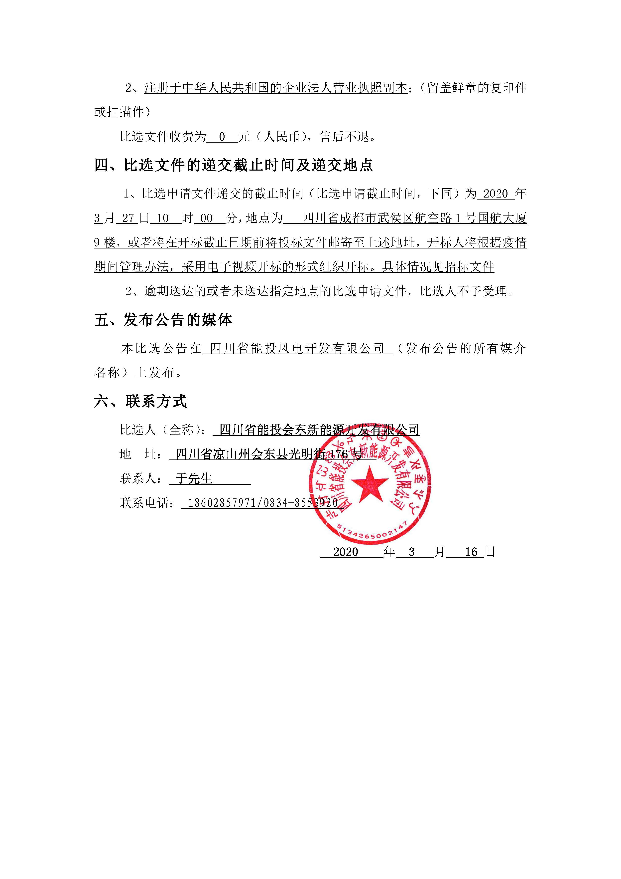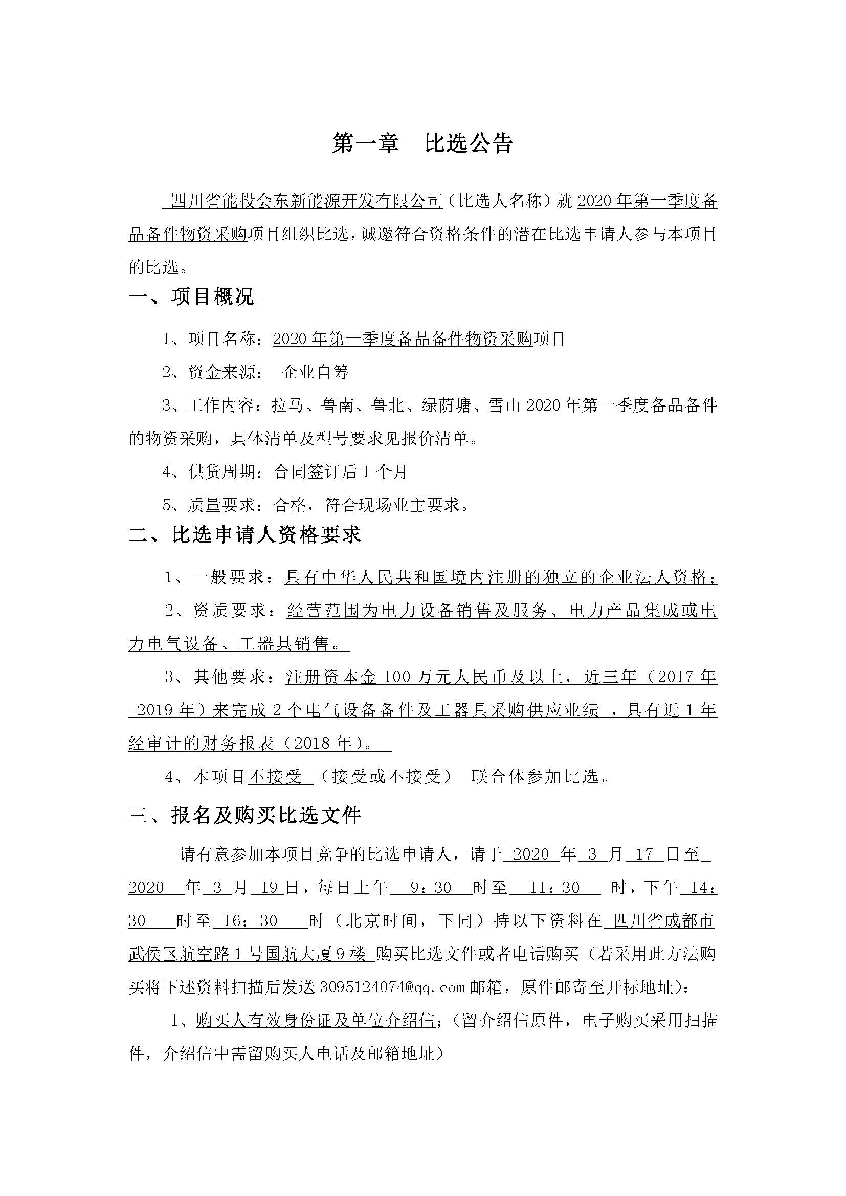 四川省能投会东新能源开发有限公司(比选人名称)就2020年第一季度备品备件物资采购项目组织比选,诚邀符合资格条件的潜在比选申请人参与本项目的比选。