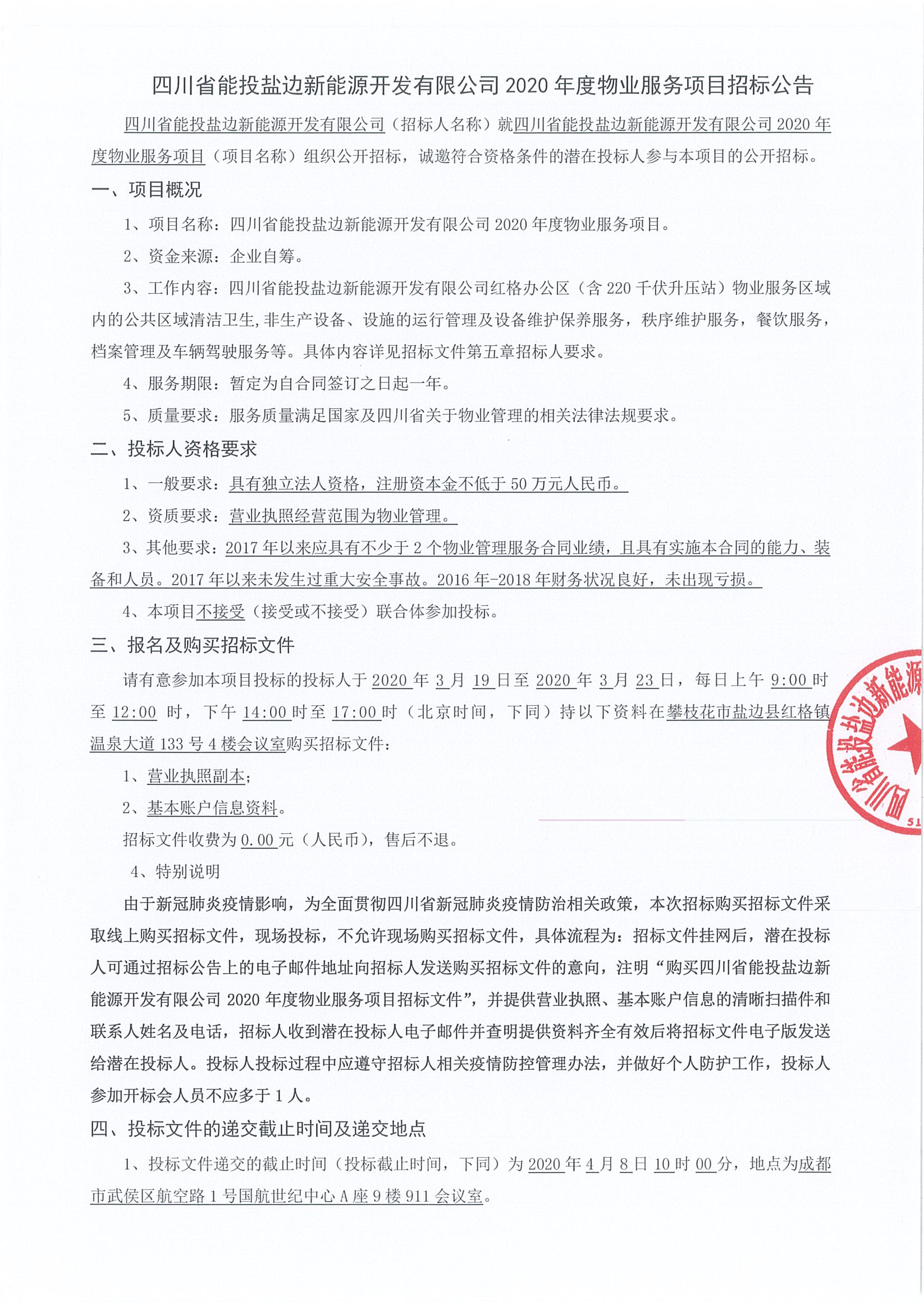 四川省能投盐边新能源开发有限公司(招标人名称)就四川省能投盐边新能源开发有限公司2020年度物业服务项目(项目名称)组织公开招标,诚邀符合资格条件的潜在投标人参与本项目的公开招标。