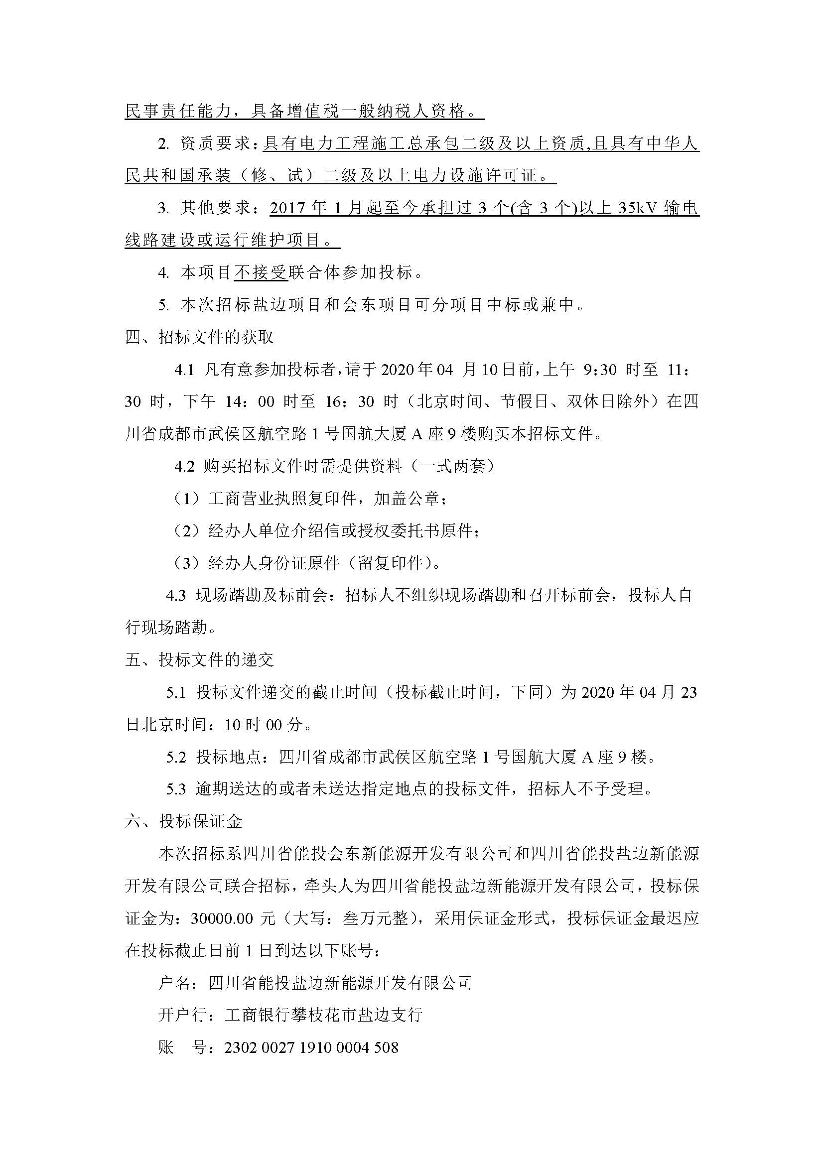 本次招标系四川省能投会东新能源开发有限公司和四川省能投盐边新能源开发有限公司联合招标,牵头人为四川省能投盐边新能源开发有限公司,投标保证金为:30000.00元(大写:叁万元整),采用保证金形式,投标保证金最迟应在投标截止日前1日到达以下账号: