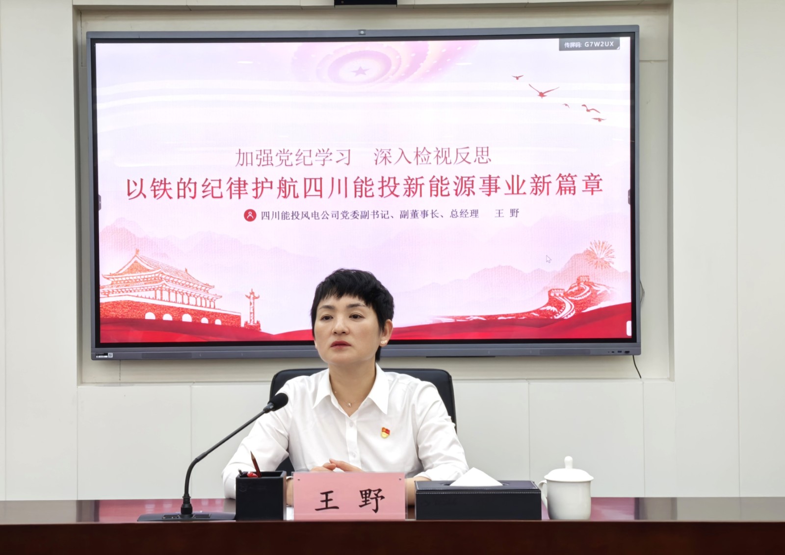 王野以《加强党纪学习 深入检视反思 以铁的纪律护航四川能投新能源事业新篇章》为题,结合自己的学习和思考,从条例修订后的显著特点、严明纪律的重要作用、加强纪律建设的重要意义等方面进行了宣讲。她要求,党员干部要对照省委书记王晓晖同志在省委警示教育会上提出的5个“问一问”,深刻反思、时刻警醒,当好风电公司政治生态的营造者和践行者。一是以“五问”问出政治忠诚,要坚持不懈用党的创新理论凝心铸魂,始终做政治上的明白人和老实人。二是以“五问”问出清廉之风,要经常审视自己的思想、情趣和行为,不断提高对不良风气的“免疫力”。三是以“五问”问出公私分明,要坚持以人民为中心的工作导向,以国资之力,助力提升群众的获得感、幸福感和安全感。四是以“五问”问出修身齐家,要把修身、齐家作为必修课,看重家庭、注重家教、涵养家风,用良好家风巩固拒腐防变的坚强“后院”。五是以“五问”问出担当尽责,要牢固树立和践行正确政绩观,紧盯重点任务,结合岗位职责,抓好工作落实,以自身的实际行动为四川能投风电公司改革发展贡献力量。