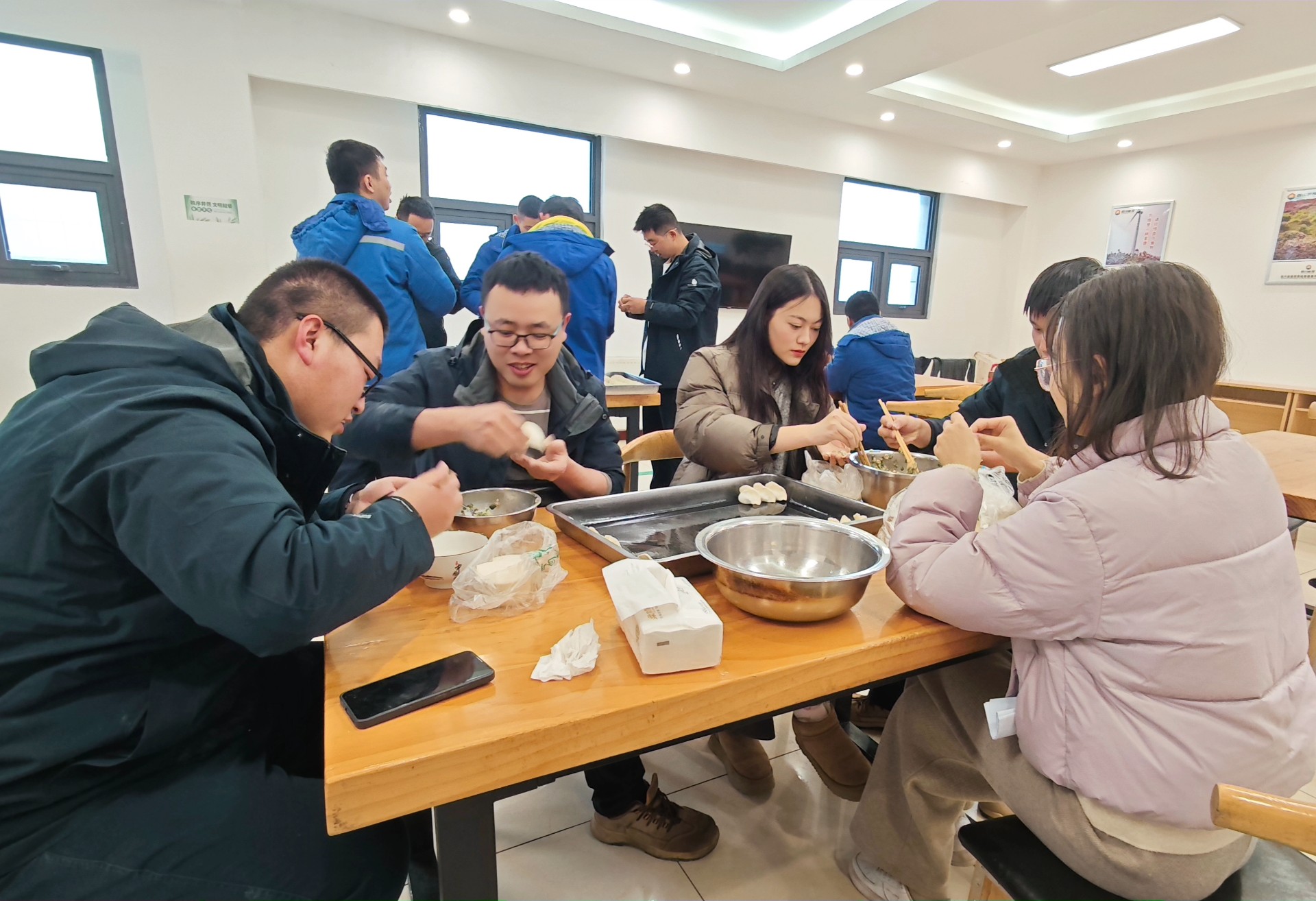 在这寒冷的冬季,风电场的餐厅却满是暖意。大家围在桌前边吃饺子边唠嗑,有说有笑,一天的疲惫一扫而光,也弥补了在冬至这一阖家团圆的节日对家人的思念。这一刻,胃是暖的,心也是暖的。